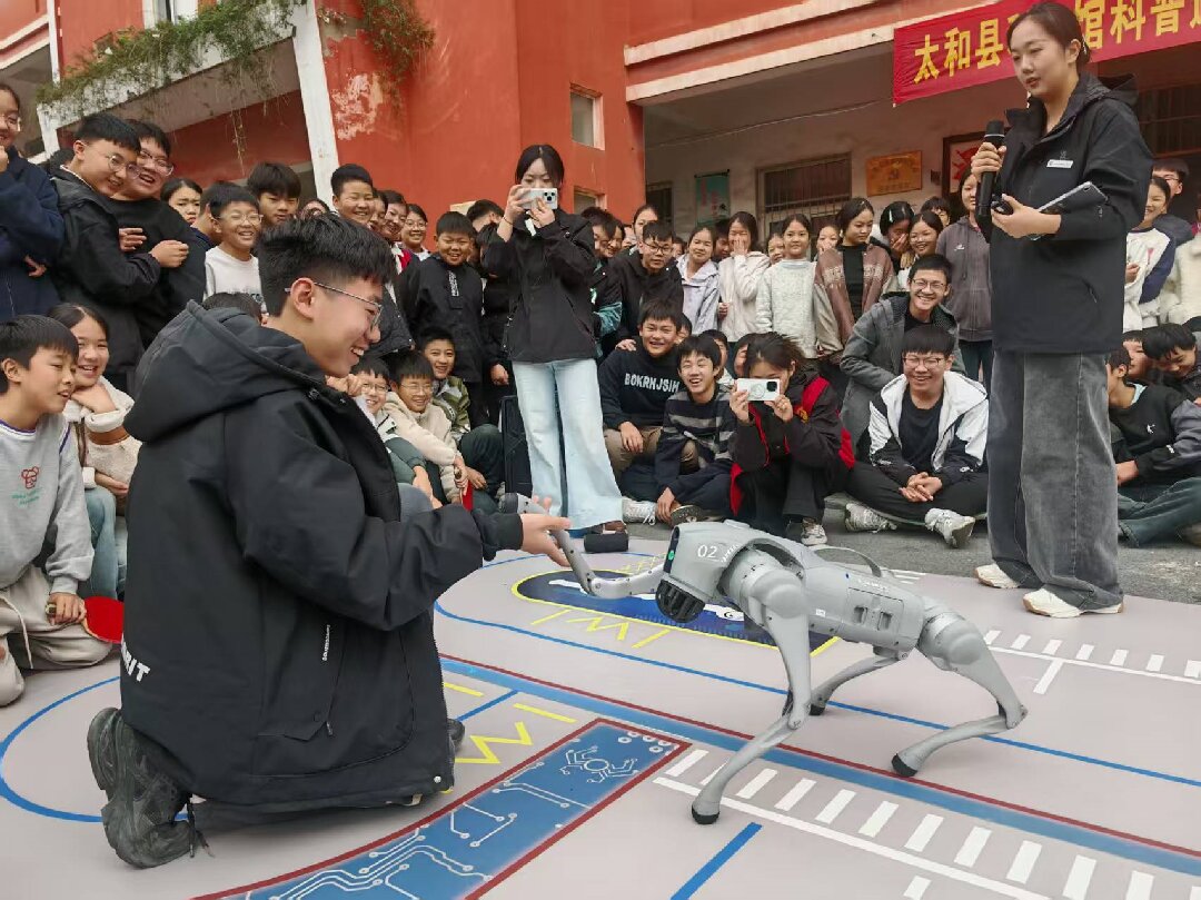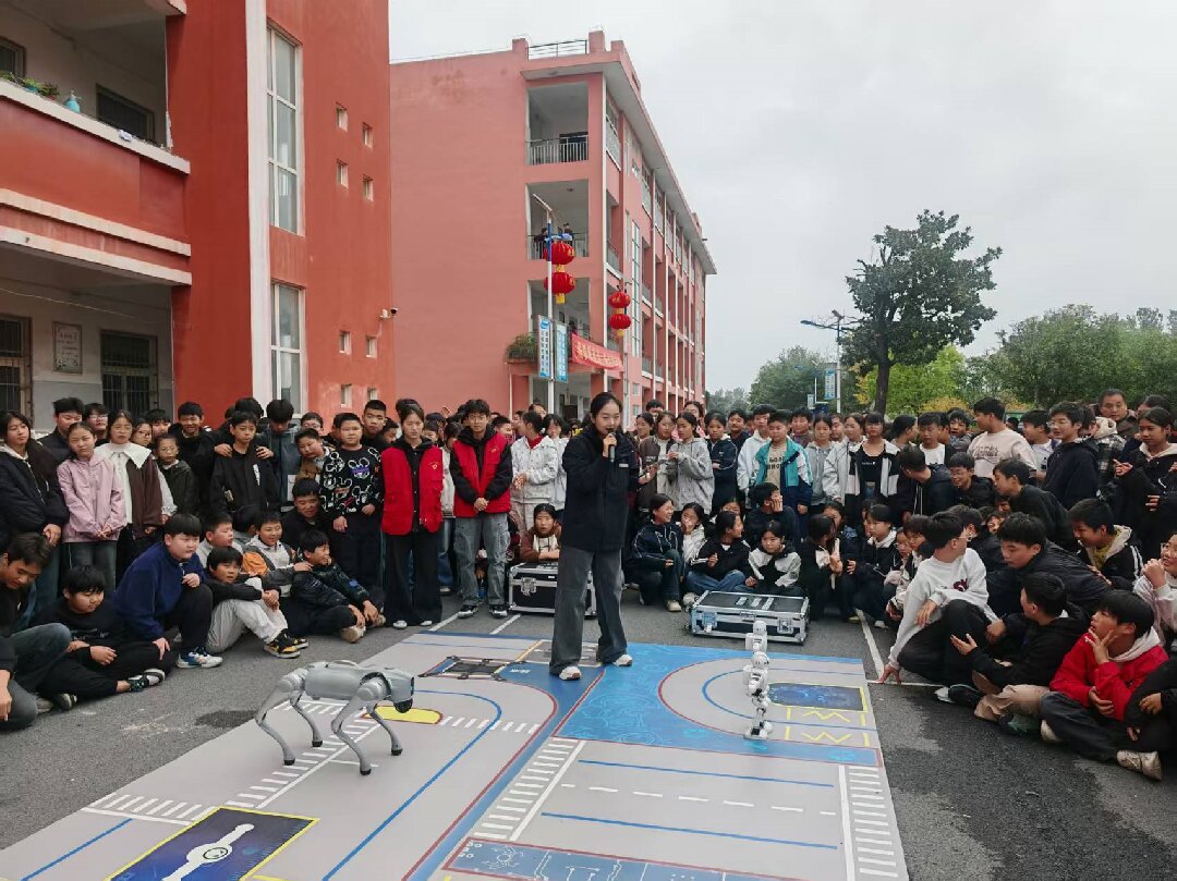活動現(xiàn)場,縣科技館帶來的智能機器狗與機器人率先登場,瞬間成為全場焦點。隨著工作人員指令,機器狗首先開始自我介紹,隨后完成跳舞、后空翻等一系列靈活動作,與學生們握手互動環(huán)節(jié)更是引得學生驚嘆不已,掌聲與歡呼聲此起彼伏。這個環(huán)節(jié)不僅讓學生感受到了科技的神奇魅力,也激發(fā)了他們對人工智能領域的濃厚興趣。