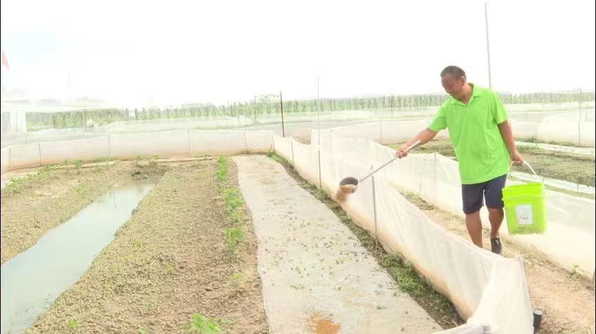 盛夏時節(jié),正是黑斑蛙生長旺季。走進(jìn)關(guān)集鎮(zhèn)梁莊村黑斑蛙養(yǎng)殖基地,一塊塊蛙池排列整齊,四周圍起了白色的紗帳,成群結(jié)隊(duì)的黑斑蛙靜靜地伏在水池邊,有的則躲在豆苗下遮陽,呈現(xiàn)出一派糧蛙和諧共生的田園景象。養(yǎng)殖戶孫磊正在給黑斑蛙喂食,眼前這片糧蛙共養(yǎng)水田,便是他的“致富田”。